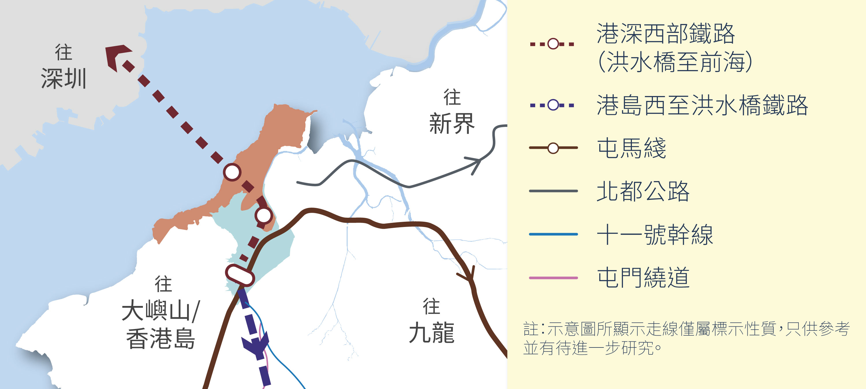 經由擬議港深西部鐵路洪水橋、厦村和流浮山站,與前海和南山建立跨境聯繫。